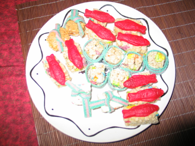 Then I put on some chocolate frosting and another later of chocolate cake. Then threw it in the freezer to harden up.Finally, I frosted and decorated it . It came out really cute. Going with Japanese theme I made assorted candy sushi with cereal and marshmallow for the first batch. You can use prepackaged rice crispy treats and fruit roll ups and candy, I used sour strip candies in this picture but had to stick it with frosting. The fruit roll ups were so much easier to use because they can bend and stick. As for the birthday dinner, I am just going to order pizzas, and make an antipasto salad. Most teens aren't fans of sushi or tempura, at least not my boys.